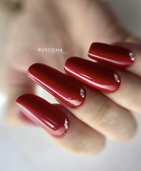 Jednobarevné valentýnské gelové nehty působí luxusně, čistě a snadno se kombinují s jakýmkoliv outfitem. Pokud chcete design lehce ozvláštnit, postačí jeden akcentní nehet s decentním detailem - tenká linka, drobný kamínek nebo jemný třpyt.