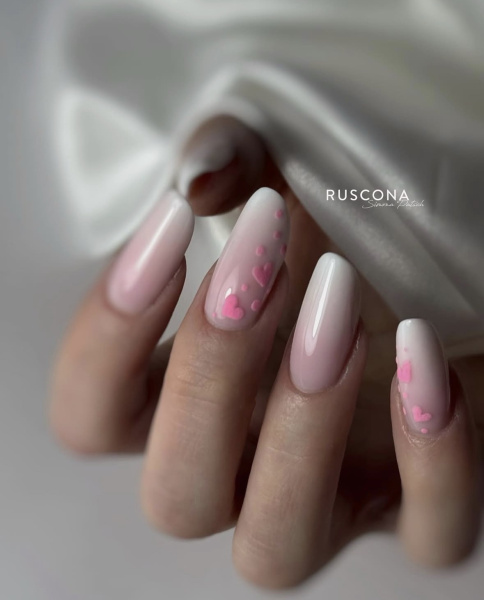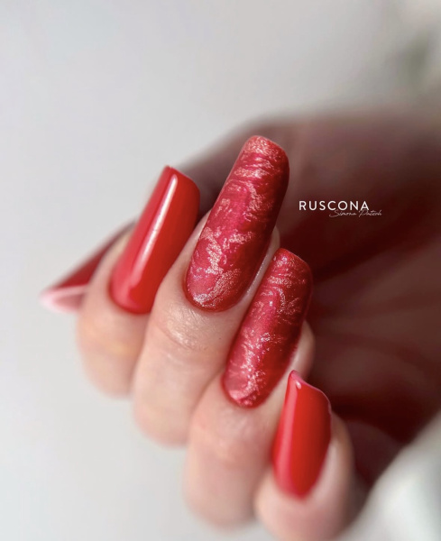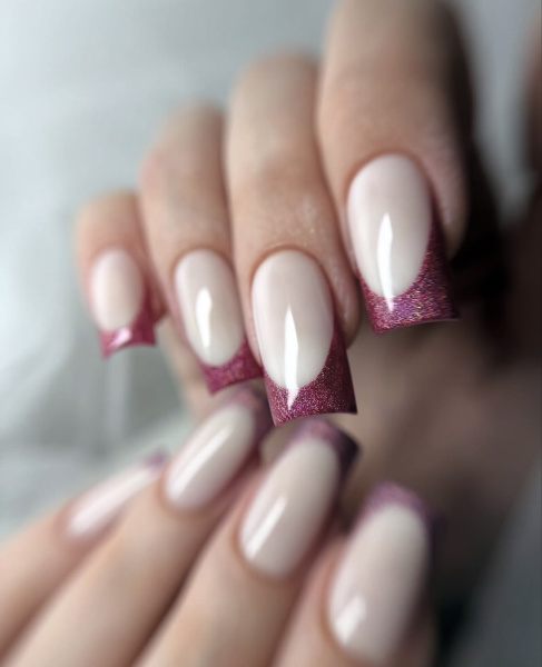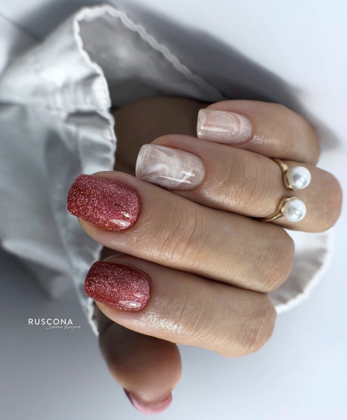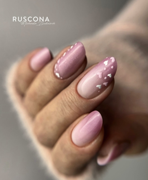 Kombinace růžových nebo červených odstínů, jemného glitteru a průhledného či mléčného základu vytváří luxusní, ale stále romantický dojem.